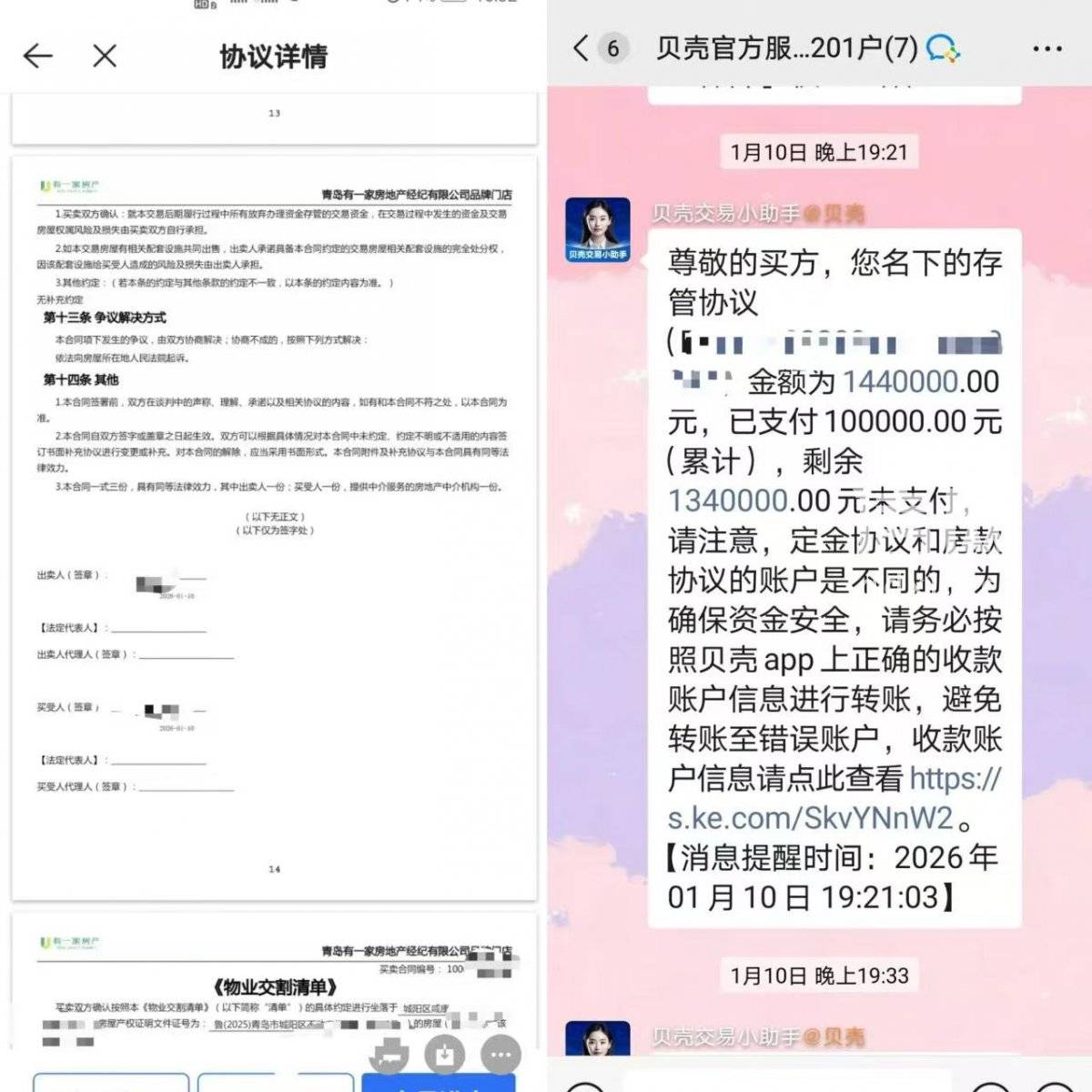 1月8日,李先生在贝壳平台留意到青岛城阳区融创红岛湾二期的一套房源信息:160.11㎡的四居室精装房,售楼处原报价260万元,现在的挂牌价只有178万元,这个价格让李先生产生了购买意向。随后,他通过贝壳平台联系到“有一家”房产中介门店的谢姓经纪人。看房后双方谈定以146万元成交,并于1月10日在贝壳签约中心完成签约。李先生当场支付了2万元购房定金和1.4万余元中介费,还按照约定从当日起陆续向贝壳共管账户转入房款。截至1月12日,李先生转入的房款已超过100万元,双方约定1月15日完成房产过户。