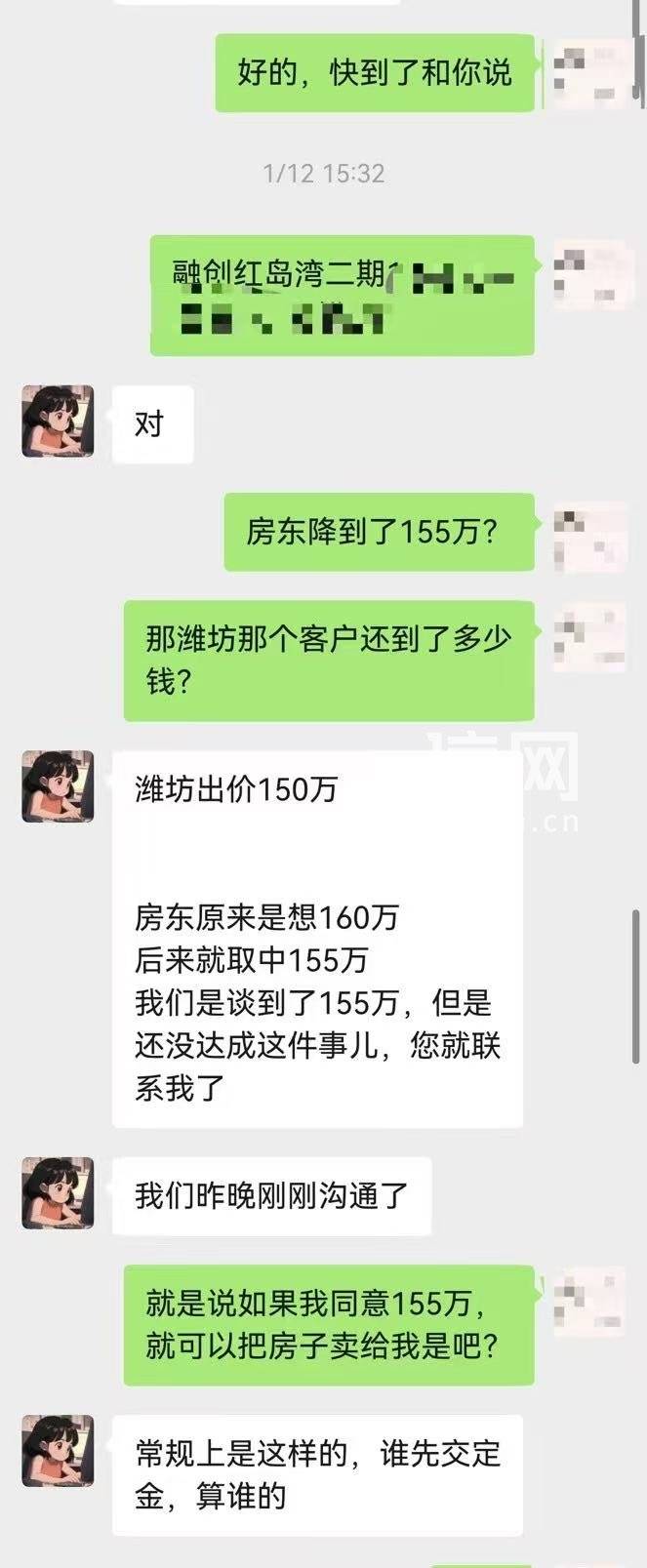 然而,这次的房屋交易并不像李先生想象的那样简单。1月12日下午,李先生接到朋友薛先生的电话,询问他是否购买了融创红岛湾二期的房子。原来,薛先生当天在安居客上看到同一套房源信息,发布者正是“有一家”中介那位谢姓经纪人。薛先生看过房子后对房源很满意,与谢姓经纪人进入议价环节。因该经纪人不断催促支付意向金,薛先生心生疑虑并托人查询,才发现该房已在贝壳系统签约。
