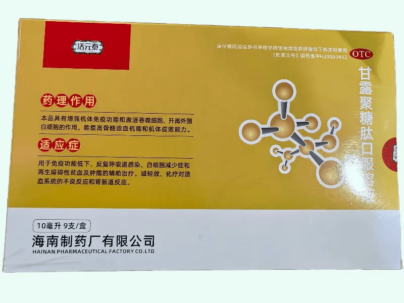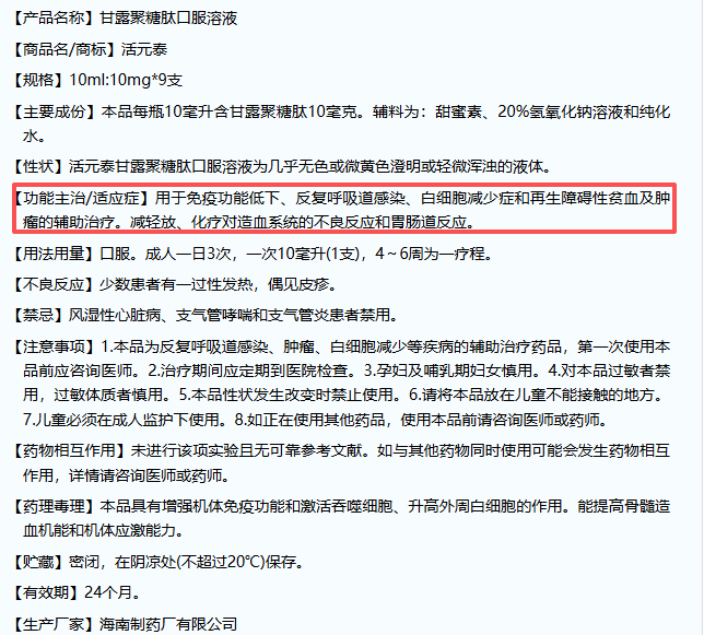 明确资质与适应症:该产品为 OTC 药品,批准文号为国药准字 H20003832,由海南制药厂有限公司生产,说明书明确标注其核心功效仅为 “增强机体免疫功能、激活吞噬细胞、升高外周白细胞,用于免疫功能低下、反复呼吸道感染、白细胞减少症、再生障碍性贫血及肿瘤的辅助治疗,减轻放、化疗对造血系统的不良反应和胃肠道反应”。