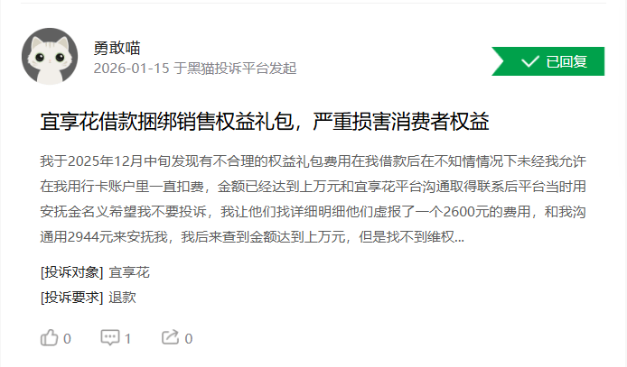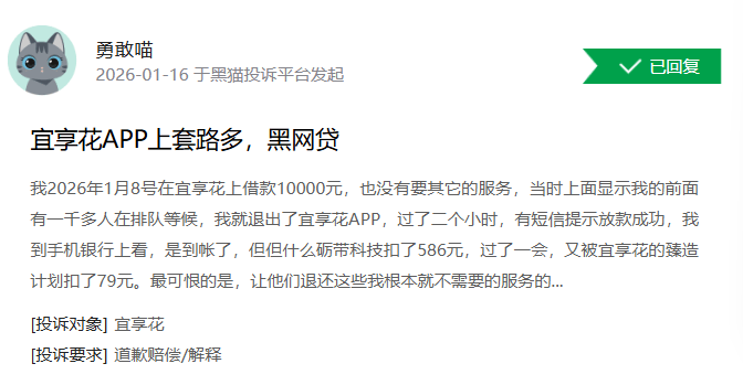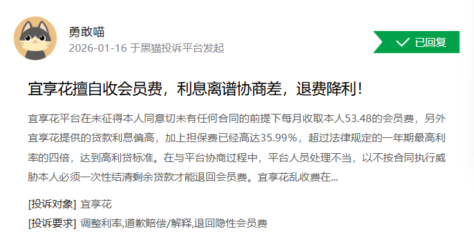 在黑猫投诉平台上,1月17日,一名用户反映,2025年在京东金融的小微企业借款里的宜享花借款37500元,本以为是正规平台,绝对靠谱,结果在2026年1月14日还完这笔贷款后,查看合同,发现年利率高达36%,多次联系宜享花官方未果。