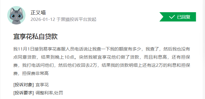 1月12日,一名用户投诉称,2025年11月1日接到宜享花客服人员电话,让查一下额度有多少。查了后,也没有点同意贷款,结果被宜享花做了贷款,且利息高,还有担保费。打电话询问,答应收回去2万元,结果,贷款明细上还有这2万的利息和担保费。