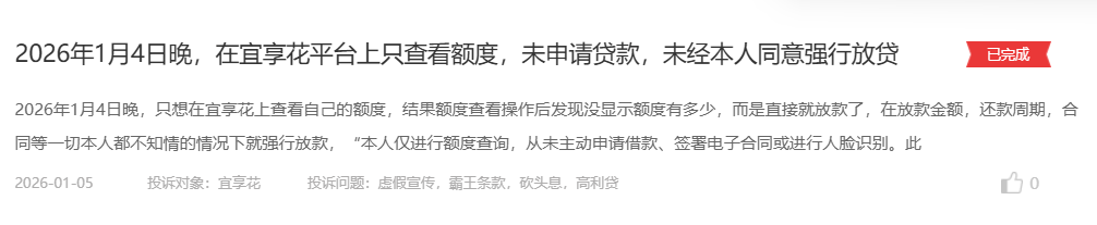 “仅进行额度查询,从未主动申请借款、签署电子合同或进行人脸识别。此笔放款违反真实意愿”在啄木鸟投诉平台上,一名用户投诉称,2026年1月4日晚,在宜享花上查看额度,发现没显示额度有多少,结果直接就放款了。在放款金额、还款周期、合同等一切本人都不知情的情况下就强行放款。