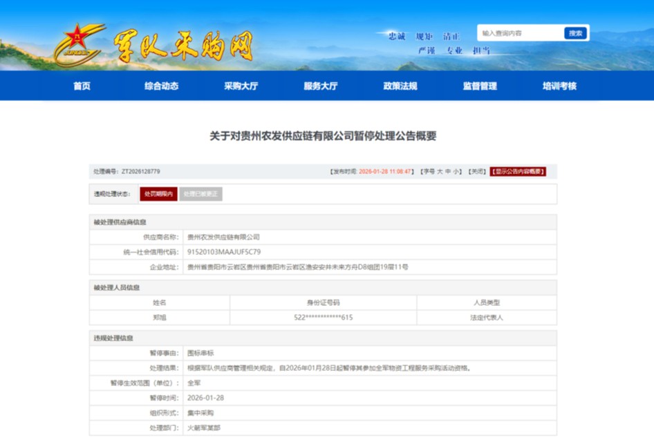 贵州农发供应链有限公司因存围标串标行为被暂停全军采购资格