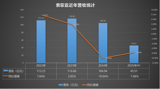 根据财报资料,2025年上半年,作为营收主力,索菲亚主品牌营收为41.28亿元,同比下滑7.09%,米兰纳品牌营收为1.76亿元,同比下滑26.53%。此外,索菲亚主要控股参股公司司米厨柜有限公司营收为2.59亿元,净亏损约130万元,索菲亚华鹤门业有限公司营收为9286万元,净亏损约1907万元。