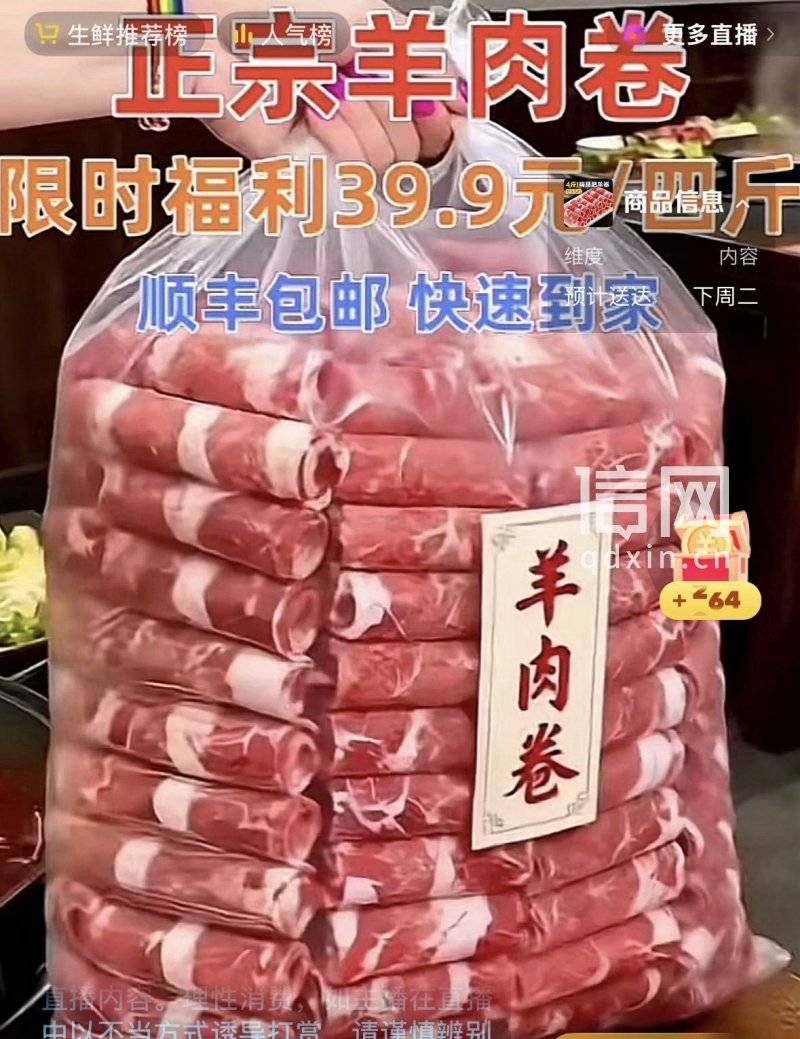据裴先生介绍,他此前在短视频平台刷到“小旭简禾手工坊”的“限时福利推广”直播——“正宗羊肉卷39.9元4斤,顺丰包邮,不好吃、不正宗可退货,保证是原切肉”。直播画面中,一大袋色泽红润、纹理清晰的肉卷上,挂着醒目的“羊肉卷”标签,右下角文字链标注着“精品肥羊卷”的名称。主播多次亲口承诺,且明确回复留言确认“系原切”,这些内容最终促成了裴先生的下单。