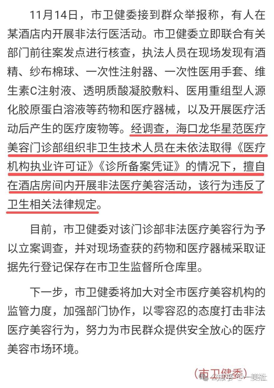 经调查,海口龙华星范医疗美容门诊部组织非卫生技术人员,在未依法取得《医疗机构执业许可证》或《诊所备案凭证》的情况下,擅自在酒店房间内开展非法医疗美容活动。