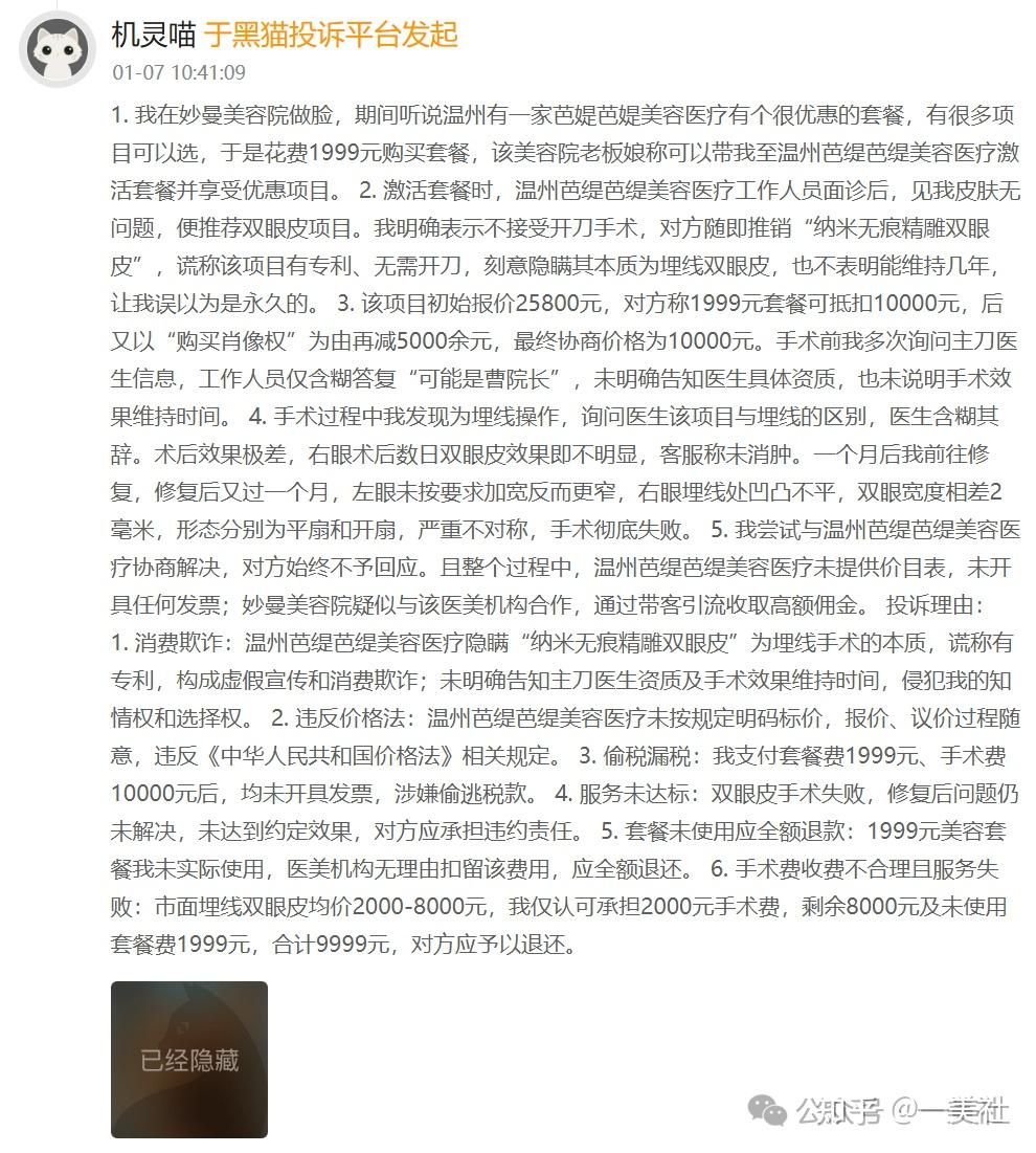 黑猫投诉平台上,另一位消费者讲述了更为严重的经历。她最初在“妙曼美容院”了解到芭媞芭媞医美的优惠套餐,支付1999元购买。