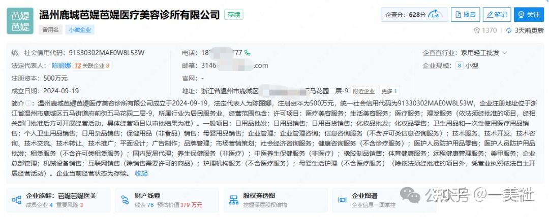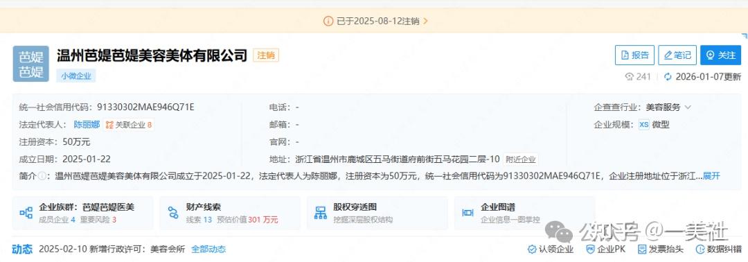 这些财务问题与陈丽娜名下的另一家公司状况相呼应。温州芭媞芭媞美容美体有限公司成立于2025年1月,注册资本50万元,却在短短7个月后即告注销。