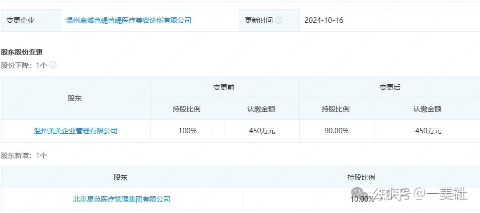 2024年10月份,芭媞芭媞医美股东信息发生变更,温州美美企业管理有限公司持股比例从原来的100%下调至90%,新增北京星范医疗管理集团有限公司为股东,持股比例为10%。