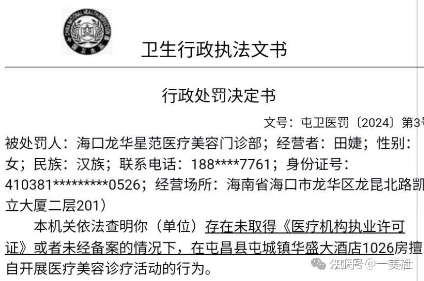 就在琼海案件曝光前不久,同一家海口龙华星范医疗美容门诊部,刚因类似的违法行为被处罚。