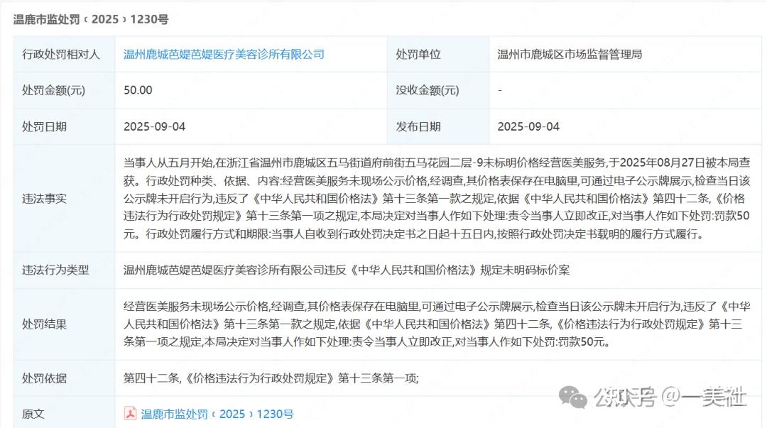 此前,芭媞芭媞曾因未现场公示服务价格,于2025年8月27日被温州市鹿城区市场监督管理局处罚。