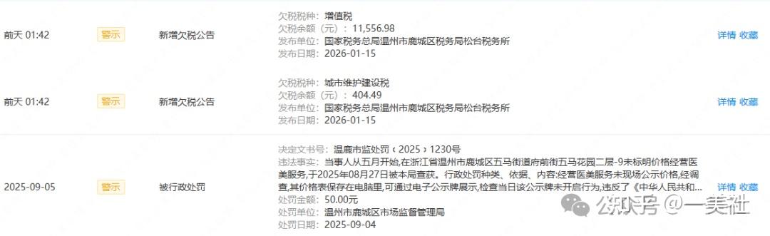 除价格违规外,一美社还发现,芭媞芭媞医美在近一个月内两次收到欠税提醒。一次欠城市维护建设税404.49元,一次欠增值税11556.98元。