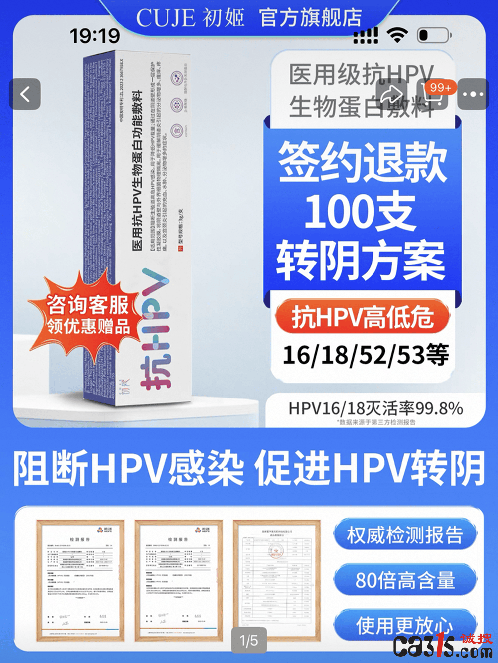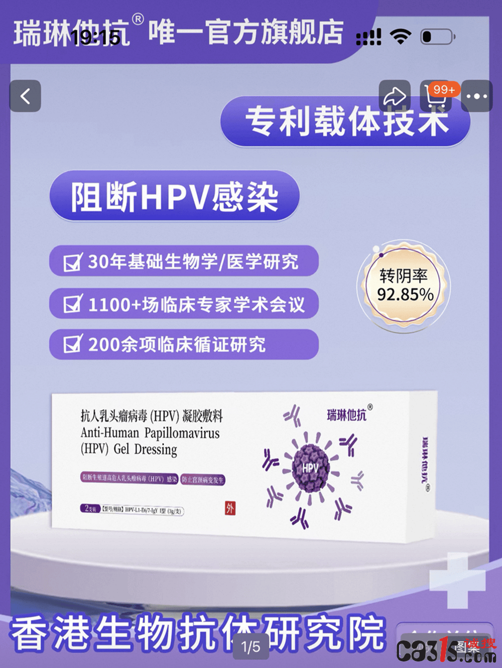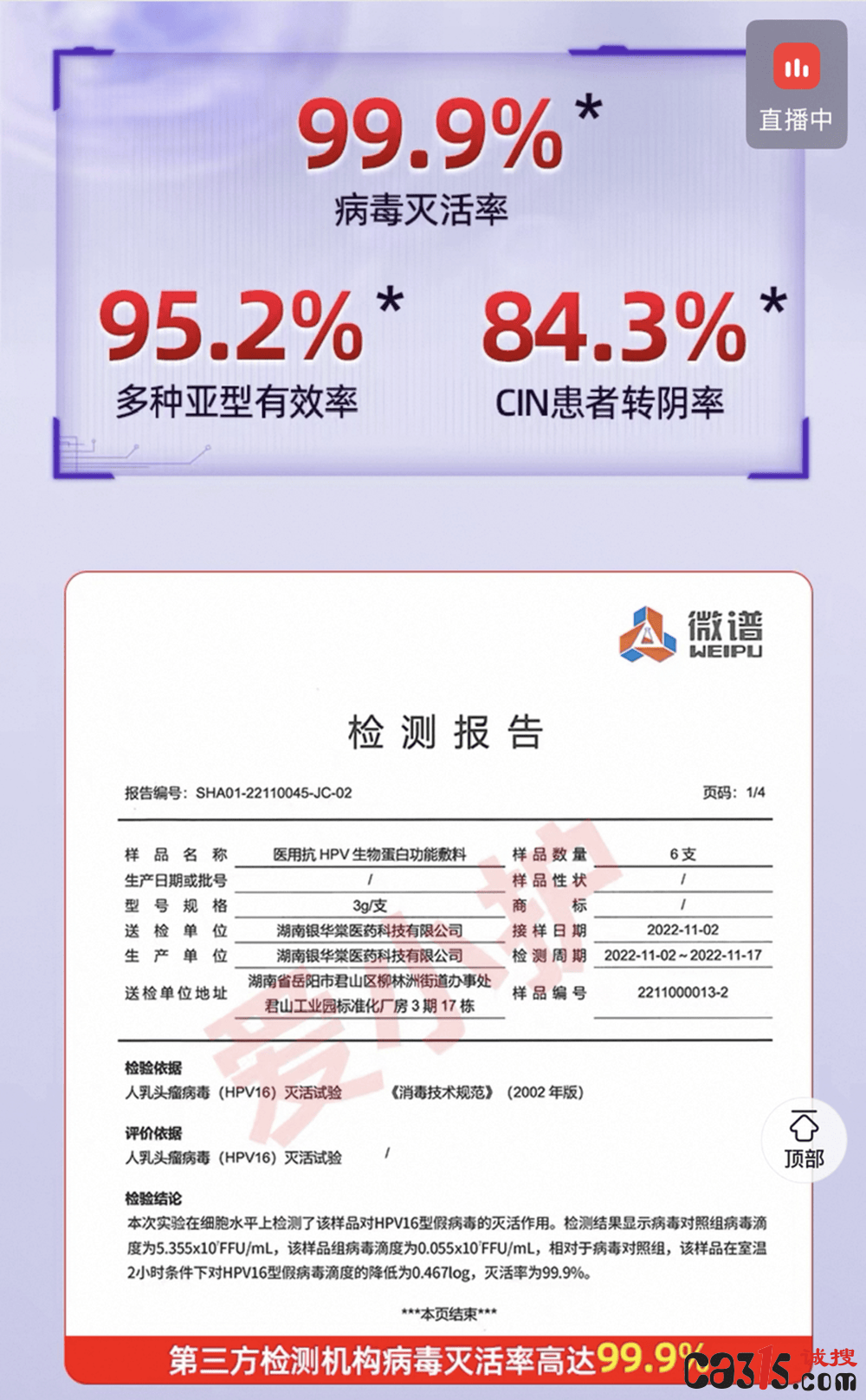 瑞琳他抗医疗器械旗舰店在宣传图中直接标注“转阴率92.85%”,爱小护旗舰店也宣称产品“转阴率高达95.2%”。但仔细查看其提供的临床报告可发现,这些数据均基于特定患者群体(如合并宫颈炎或CIN1期患者)的研究,不能简单推及所有HPV感染者。