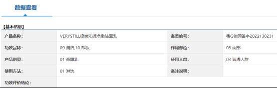 通过药监局官网查询发现,备案编号为“粤G妆网备字2022130231”的“VERYSTILL极尚沁透净澈洁面乳”,备案功效仅为“清洁、卸妆”,并没有网页和直播间宣传的全能选手那样,集“舒缓、修护屏障、补水保湿、滋养锁水、焕亮肌肤”于一身的,甚至敢打“强抑黑”这种只有特殊用途化妆品(祛斑美白类)才能宣称的功效。这已经不是夸大其词,而是赤裸裸地踩了监管红线。