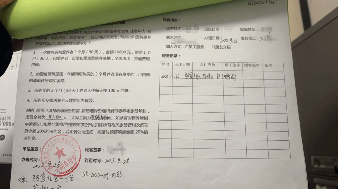 张女士提供了母亲与对方公司所签的协议,华商报大风新闻记者看到,协议上写着:经公司研究决定,特推出和爱特惠养老服务项目。一次性购买和爱养老6个月(180天),金额21600元,可入住和爱公司西安、海南、山东、四川等自有康养基地,如顾客选择入住公司非自营合作康养基地,收费标准另行商定。全国通用,交通费用自理。
