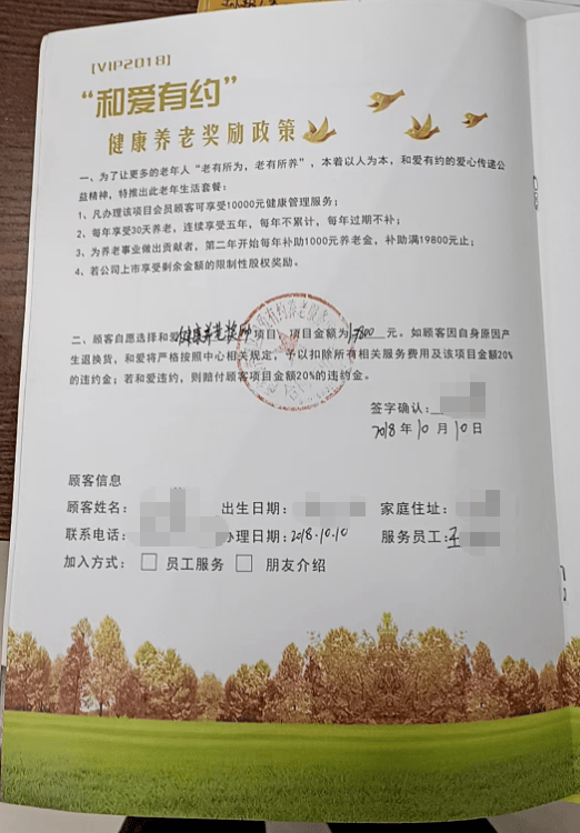 此外,还有一份“‘和爱有约’初级养老会员套餐”,项目金额19800元,落款盖章公司为西安和爱实业有限公司,同时有孙老太太的签名,时间为2017年9月15日。与上述协议一样,“服务员工”均为王某艳。