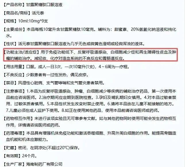 该产品为OTC药品,批准文号为国药准字H20003832,由海南制药厂有限公司生产。说明书明确标注其核心功效仅为增强机体免疫功能,用于免疫功能低下、反复呼吸道感染、白细胞减少症及肿瘤的辅助治疗。