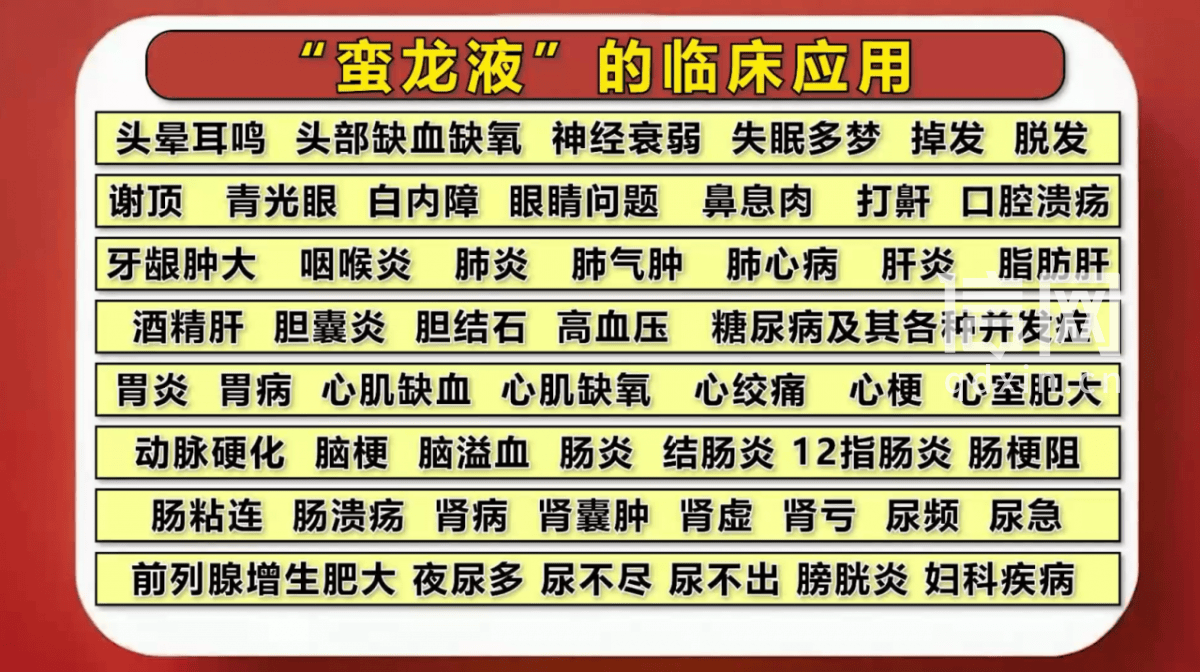 节目中列出“蛮龙液”的临床应用。(来源:受访者)