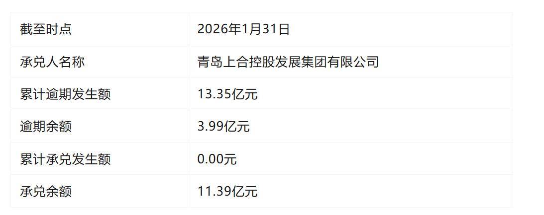 上海票据交易所最新披露数据显示,截至2026年1月31日,青岛上合控股发展集团有限公司(下称“青岛上合控股”)票据承兑逾期余额已达3.99亿元,累计逾期发生额更是高达13.35亿元。