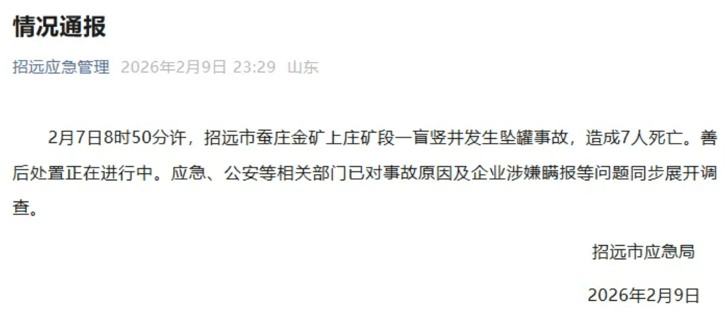 消息面上,据新华社报道,2月9日晚,招远市应急局发布情况通报:2月7日8时50分许,招远市蚕庄金矿上庄矿段一盲竖井发生坠罐事故,造成7人死亡。善后处置正在进行中。应急、公安等相关部门已对事故原因及企业涉嫌瞒报等问题同步展开调查。