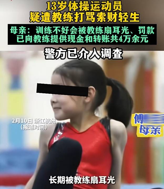 据此前报道,13岁体操运动员傅佳丽母亲公开表示,孩子在校期间长期遭教练扇耳光、辱骂,还被以过节送礼、训练罚款等名义索要钱财,家属与孩子累计转账、现金共计4万余元。