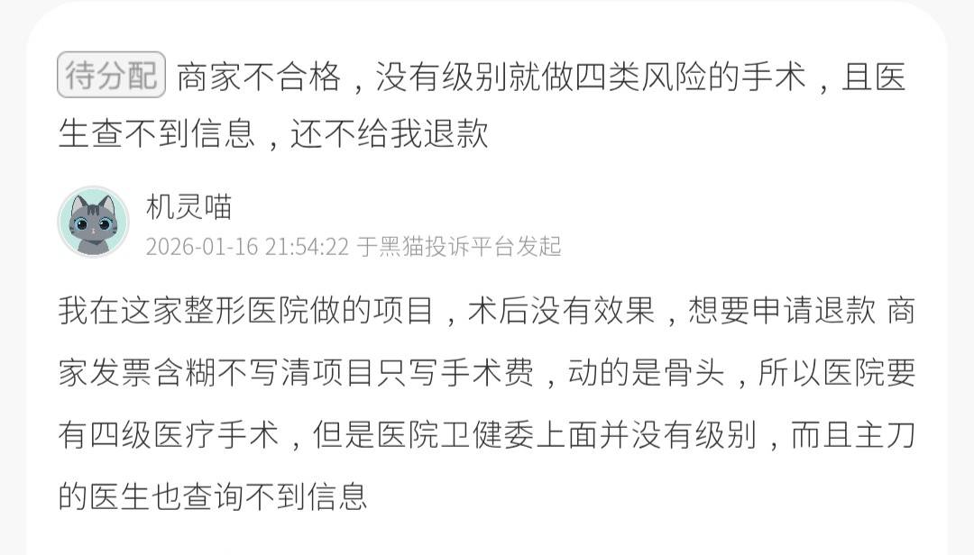 该消费者表示,院方开具的发票仅笼统标注“手术费”,未列明具体项目,由于手术涉及骨骼动刀,需具备四级医疗资质,但该消费者在卫健委官网未能查到该机构的级别信息,且主刀医生亦无法查询到相关执业信息。