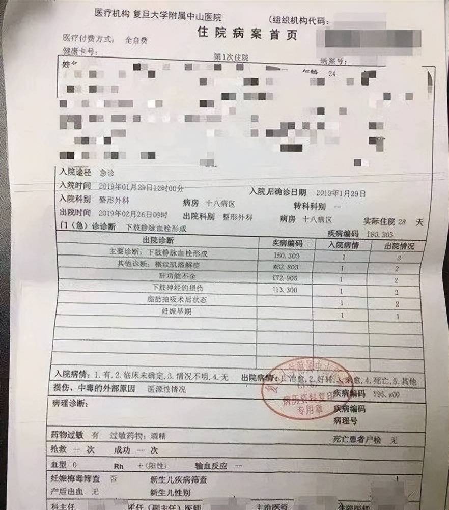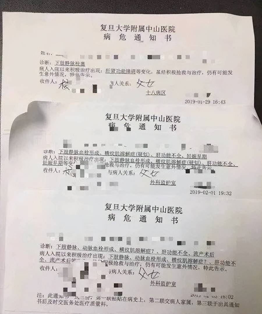 2019年1月29日,在家属强烈要求下,美立方将杨小姐转入中山医院。入院后中山医院连续发出三张病危通知书,诊断结果为抽脂术后下肢静脉血栓形成、横纹肌溶解、肝功能不全以及早期妊娠。医生指出转院时机过晚,治疗已被耽搁。杨父谈及女儿经历时数次哽咽。他透露,在美立方住院期间,为缓解疼痛,女儿每日多次被注射杜冷丁及安定等药物。事后杨父多次向美立方索要病历,对方仅提供一张发票凭证。中山医院的入院记录中特别注明,患者于外院进行的“双侧大腿环形抽脂术”手术记录缺失,术后对症治疗详情不明。