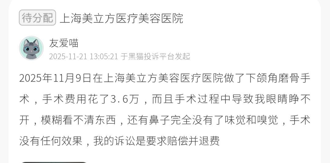 深度美业发现,关于该机构磨骨手术的投诉不止一起,2025年11月21日,就有反映说,其于同年11月9日在上海美立方医疗美容医院接受下颌角磨骨手术,支付费用三万六千元,术中即出现双眼无法睁开、视物模糊及嗅觉味觉完全丧失等症状,术后亦未见任何改善,现诉求为赔偿并退还全部手术费用。