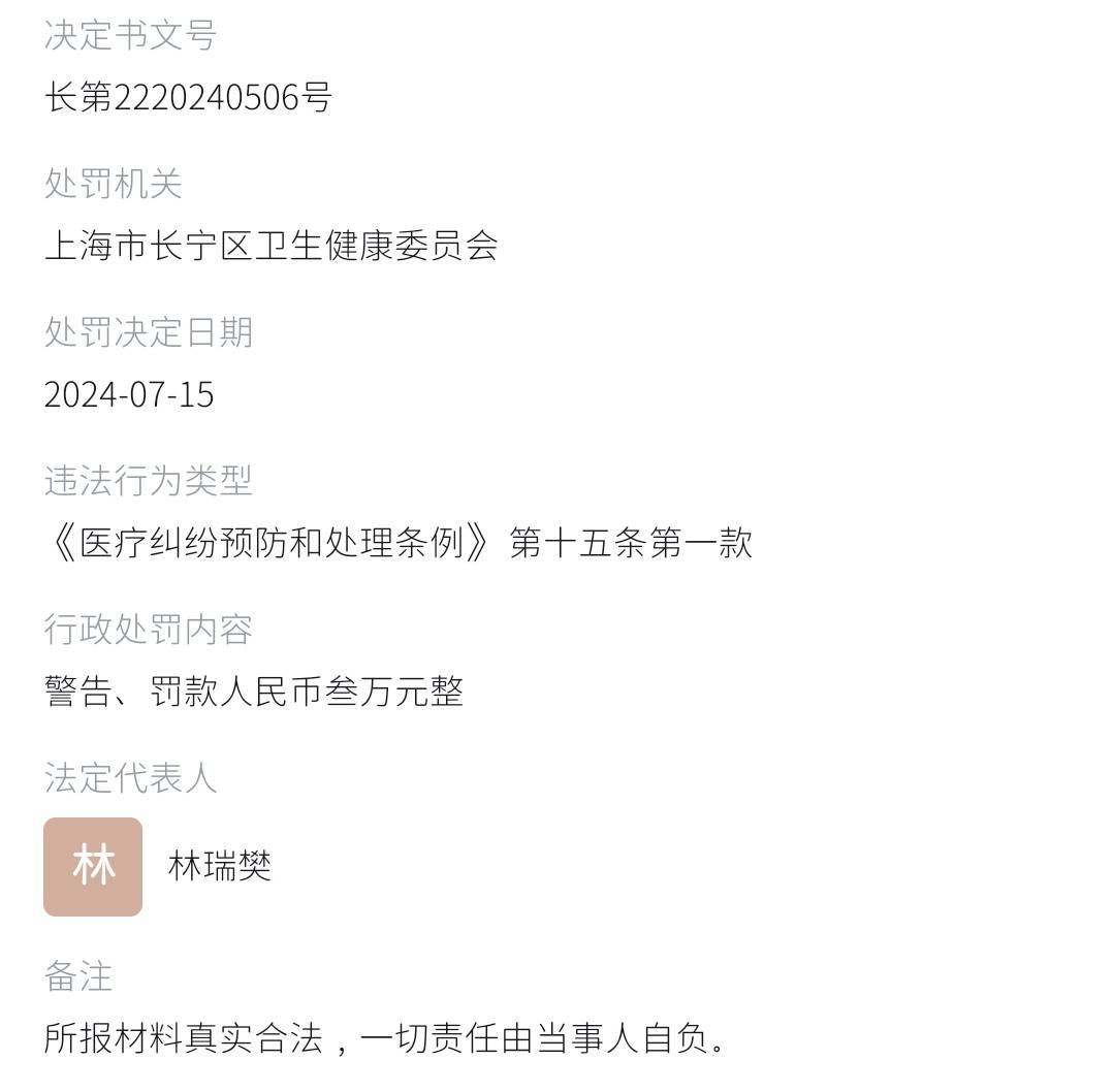 同年7月15日,上海市长宁区卫生健康委员会因上海美立方医疗美容医院违反《医疗纠纷预防和处理条例》第十五条第一款,对其处以警告并罚款3万元的行政处罚。