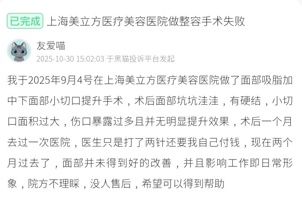 1月16日,有消费者于黑猫投诉平台反映,称其在“上海美立方医疗美容”接受手术项目后未见效果,申请退款却遭拒。