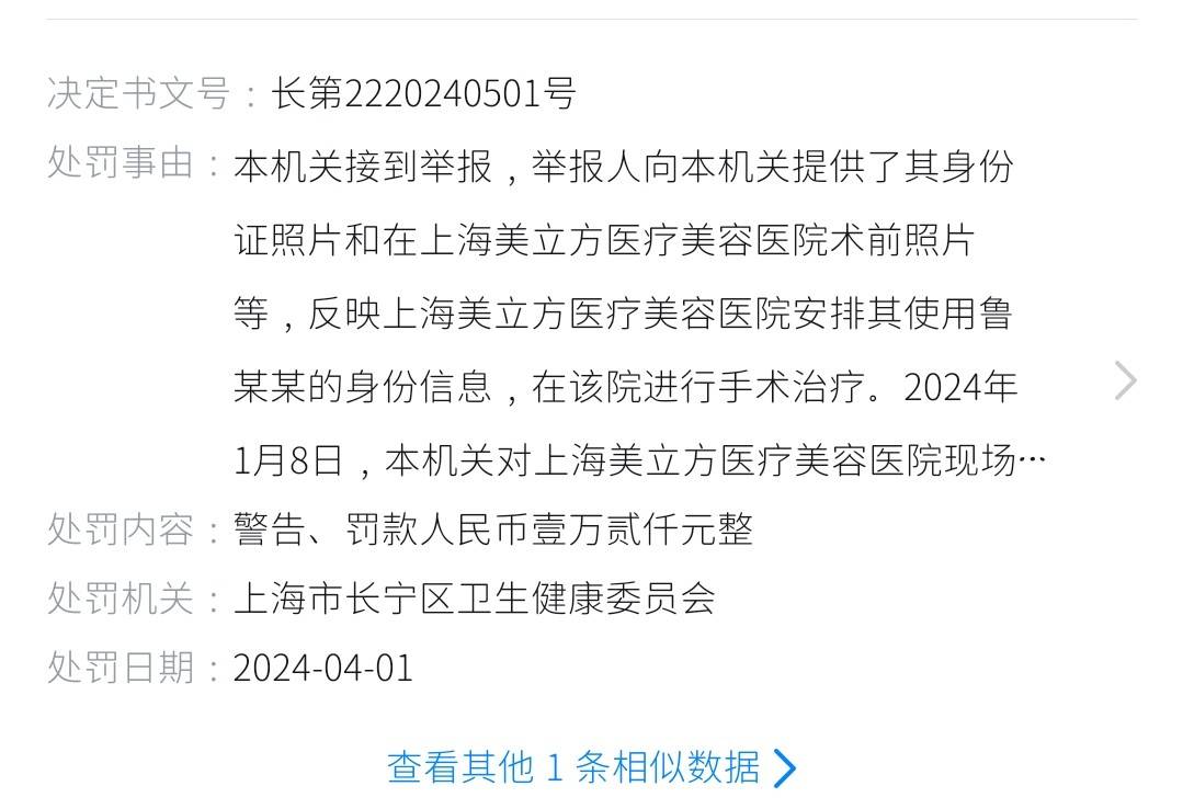 同年同月21日,上海市长宁区卫生健康委员会因上海美立方医疗美容医院违反《医疗机构管理条例》第27条,对其处以警告并罚款5万元的行政处罚。