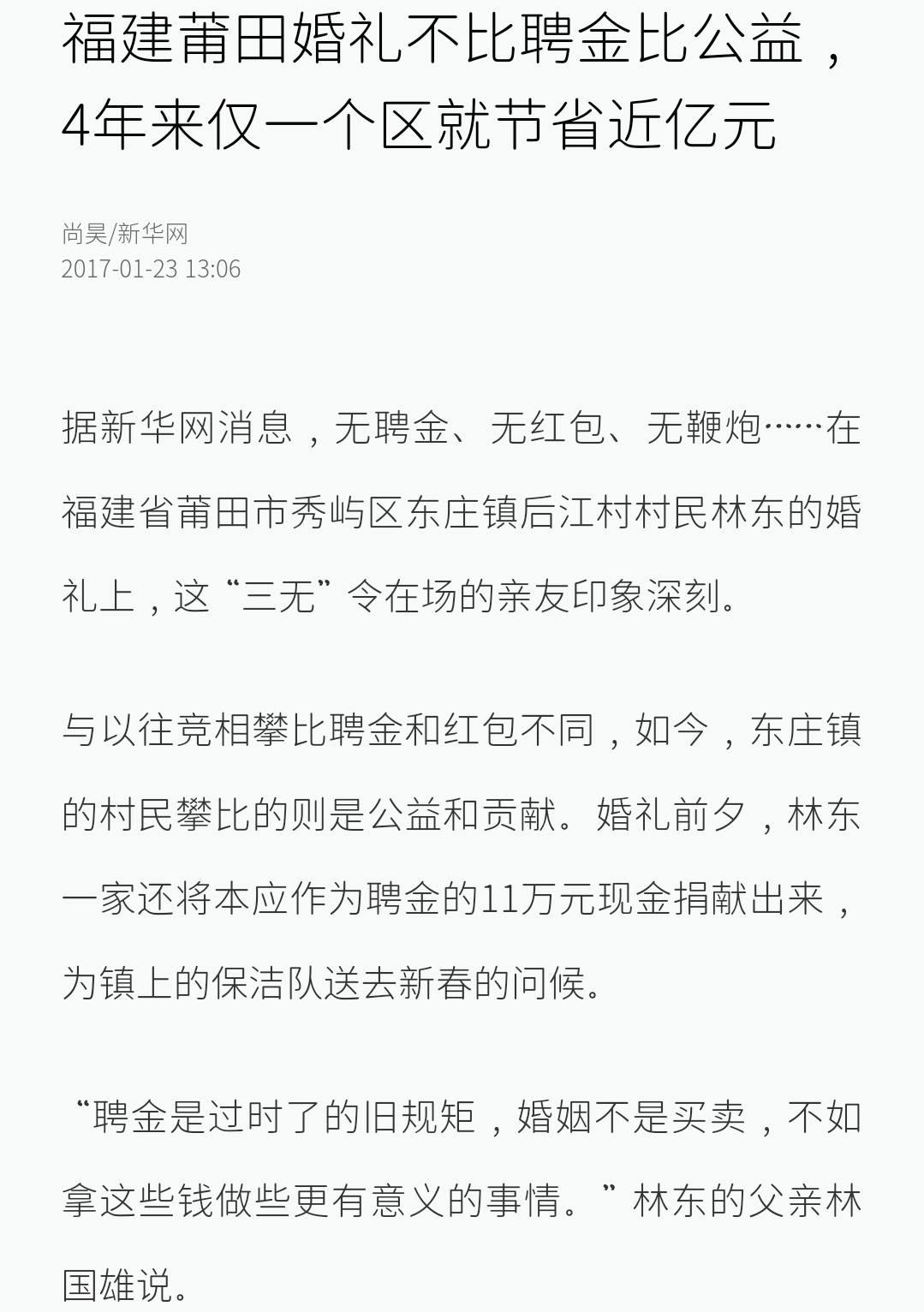 文章中清晰地写道:“聘金是过了时的旧规矩,婚姻不是买卖,不如拿这些钱做些更有意义的事情。”林东的父亲林国雄说。