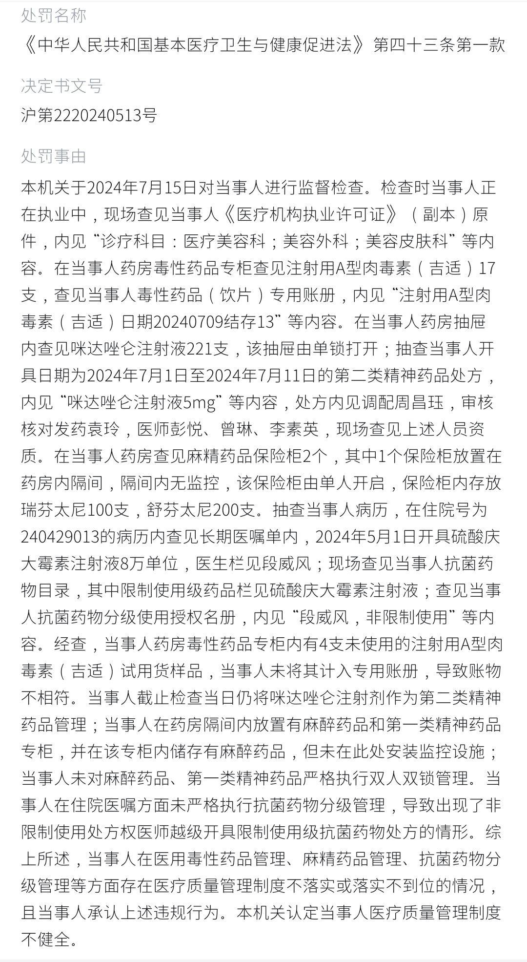 公开资料显示,2024年8月23日,上海美立方医疗美容医院因医疗质量管理制度严重不健全,被上海市卫生健康委员会依据《中华人民共和国基本医疗卫生与健康促进法》第101条处以警告并罚款28000元的行政处罚。经查,该机构在医用毒性药品管理方面存在注射用A型肉毒素未计入专用账册导致账物不符的问题,在麻精药品管理方面存在未对麻醉药品和第一类精神药品严格执行双人双锁管理,且未在储存专柜安装监控设施的违规行为,在抗菌药物分级管理方面,存在住院医嘱未严格执行分级管理制度,导致非限制使用处方权医师越级开具限制使用级抗菌药物硫酸庆大霉素注射液的严重违规情况,上述行为均被查实且该机构承认相关违规事实。