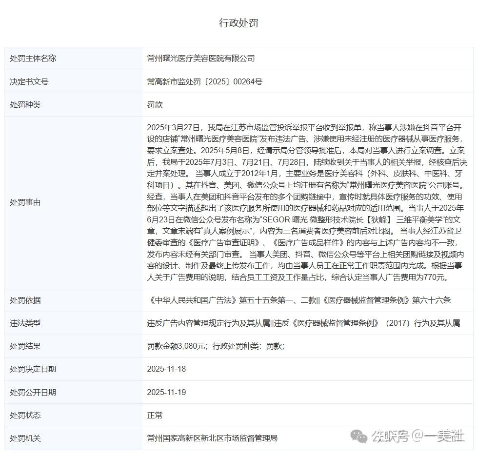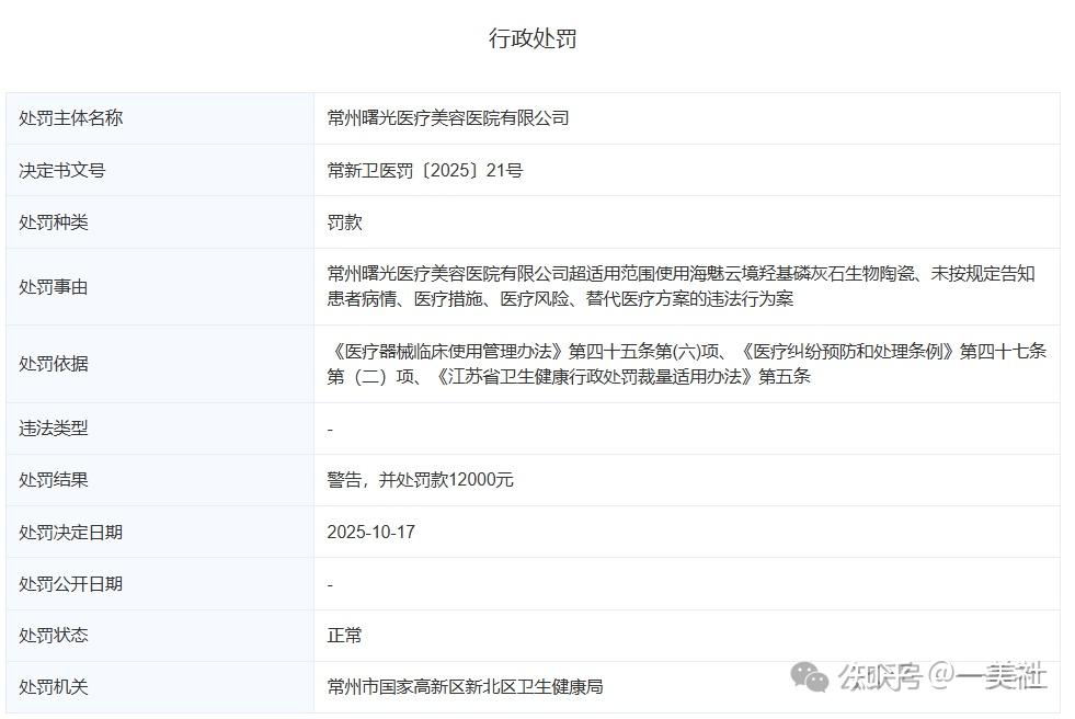 此外,2025年10月17日,常州曙光医美还存在因超范围使用医疗器械及未履行告知义务而受到处罚的情况。