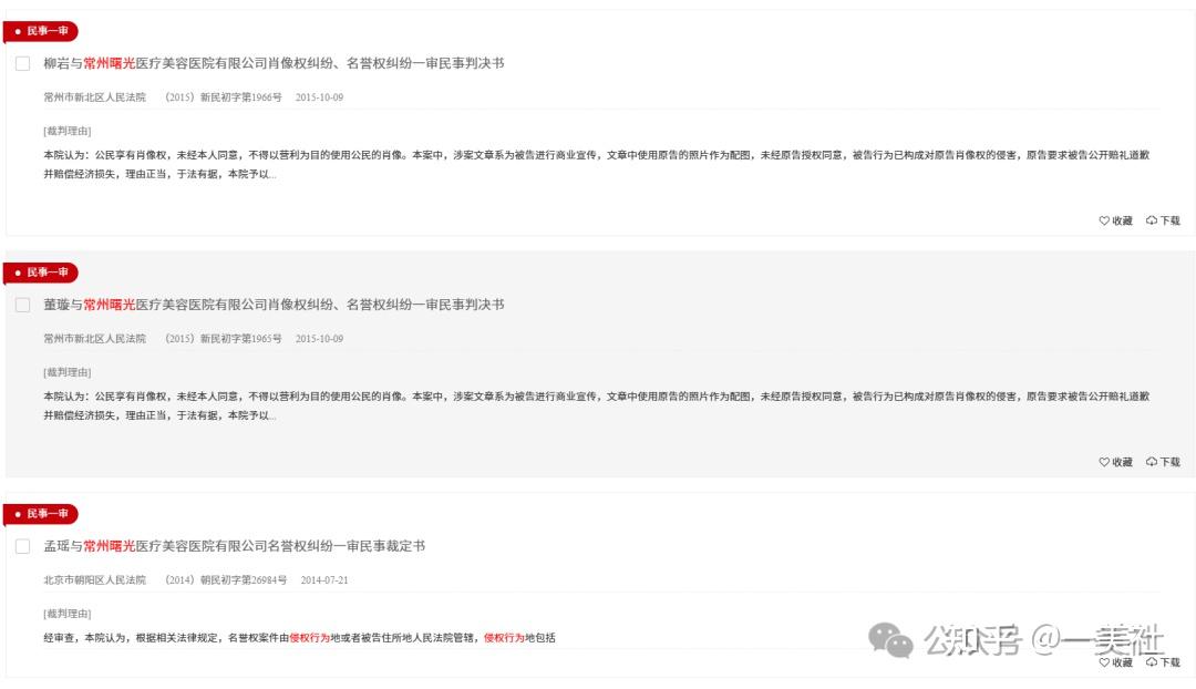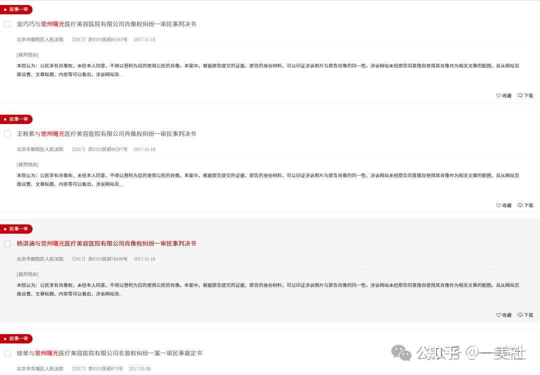 中国裁判文书网显示,2014-2017年间,常州曙光医美存在8项侵权行为,包括金巧巧、柳岩、董璇、王秋紫等明星状告其侵犯肖像权或侵犯名誉权,要求其赔偿并道歉。
