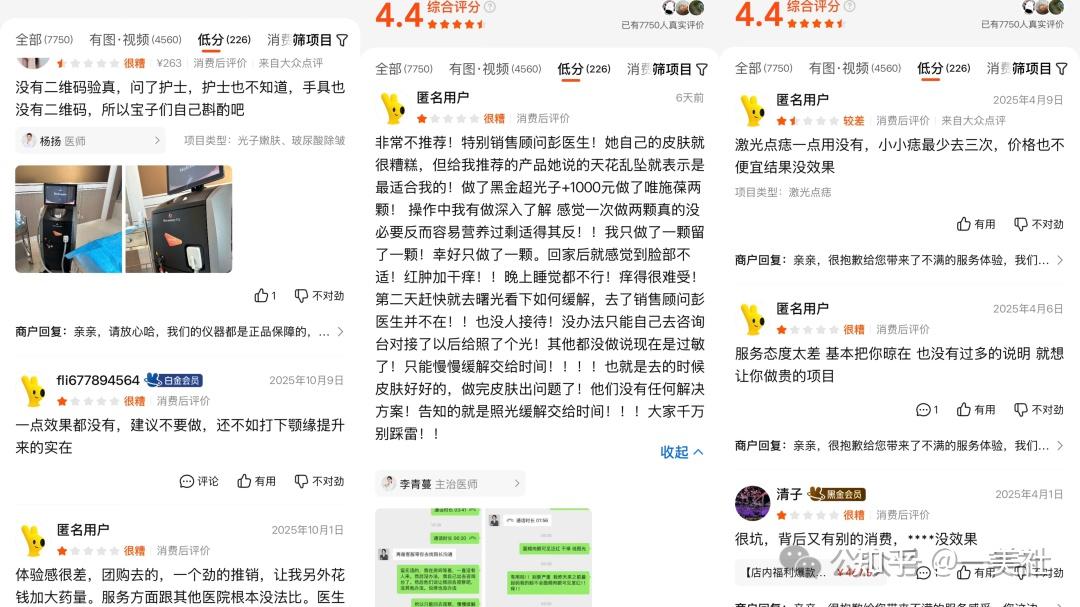 美团平台显示,常州曙光医美评分为4.4分,有7000多条评论,其中有226条低分评价。差评主要集中在体验差、服务态度差、效果不好、缺少二维码验真、频繁被推销等方面。服务“太潦草”、“很敷衍,麻药都糊到我眼睛上了,点完痣的药膏都没涂对地方”,“各种体验都太糟糕,去了就推销更贵的”,“环境不错,态度很差”,“消费的限制性条款不公”,“便宜团购的但是没有效果”…