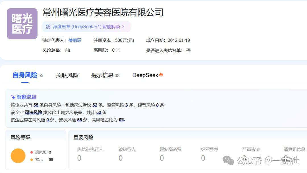 截至2026年2月的信息显示,常州曙光医美存在55项自身风险,已被最高人民法院列为失信公司(俗称“老赖”),并累计涉及3条行政处罚、18份裁判文书,风险事件包括立案17条、开庭公告14条。这为其宣称的“港式轻奢”与“诚信”理念蒙上了一层阴影。其中,涉6项肖像权纠纷,3项名誉权纠纷。