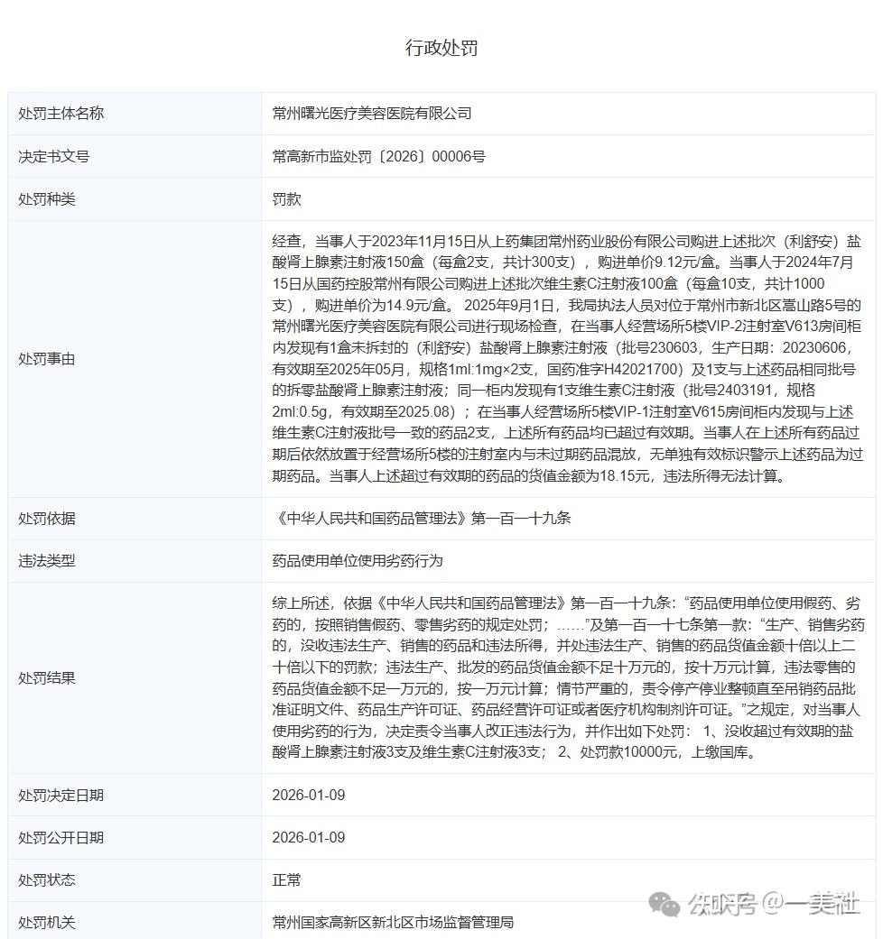 2026年1月9日,常州市市场监督管理局执法人员在对常州曙光医疗美容医院有限公司(以下简称“常州曙光医美”)进行现场检查时,发现其经营场所内存放并涉嫌使用超过有效期的药品。