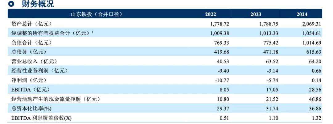 近年来,由于山东铁投主业毛利润不足以覆盖财务费用,公司处于持续亏损状态。截至2024年末,山东铁投营业收入为64.20亿元;利润总额8523.83万元,净利润1409.38万元;总资产2069.31亿元,总负债1014.69亿元,资产负债率49.04%;净资产1054.61亿元,净资产收益率-0.33%;经营现金流量净额46.86亿元;流动比率246.53%。