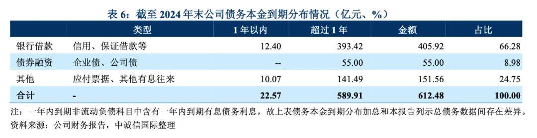 从有息债务结构来分析,2024年公司总债务615.63亿元,短期债务为25.72亿元,长期债务为589.91亿元,债务期限结构较为合理。其中银行借款占债务本金比重为66.28%,债券融资占比为8.98%,应付票据、其他有息往来等项占比为24.75%。
