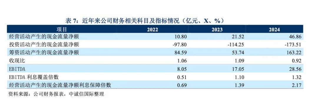 从偿债指标来看,截至2024年末,公司流动比率246.53%,速动比率236.71%,短期偿债能力较好。同期EBITDA为28.56亿元,同比大幅增长主要系2024年末利润总额由负转正、费用化利息费用同比增加;同期EBITDA利息覆盖倍数为1.32倍,经营现金流量净额利息保障倍数为2.17倍。