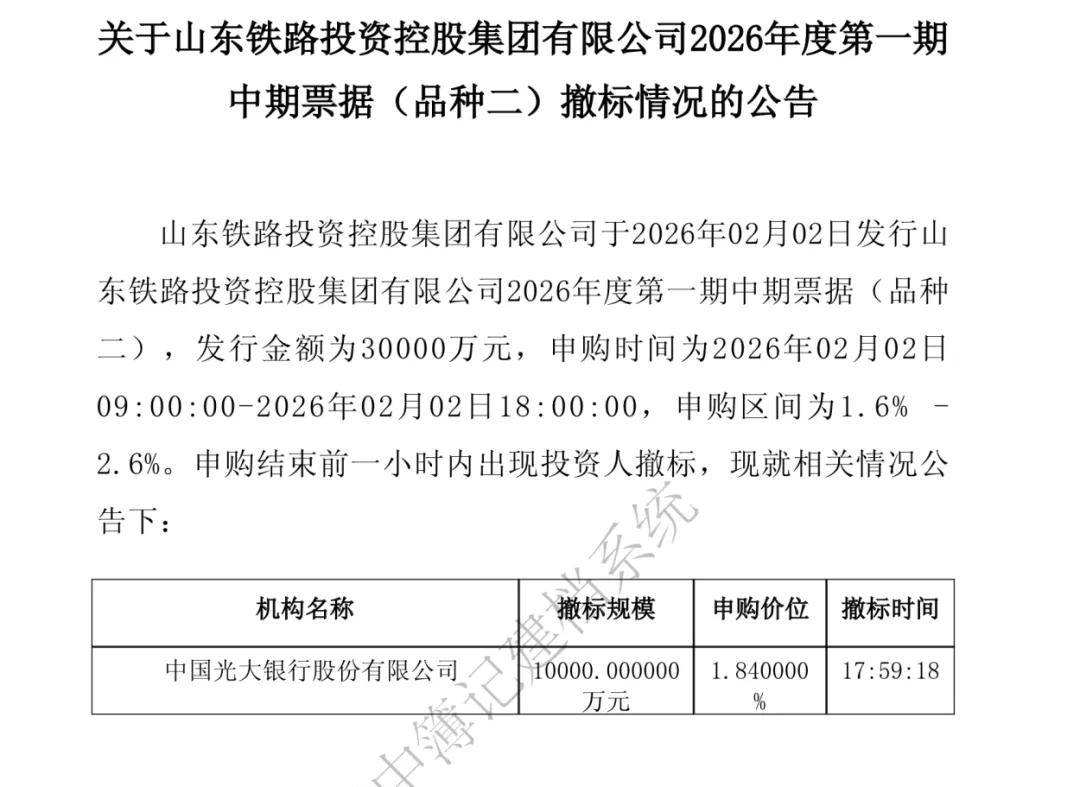 2026年2月2日,山东铁路投资控股集团有限公司(下称“山东铁投”或“公司”)发行2026年度第一期中期票据(品种二),发行金额为3.00亿元,申购区间为1.6%-2.6%;募集资金拟全部用于偿还有息负债。申购结束前一分钟内,中国光大银行股份有限公司撤标1.00亿元,申购价位为1.84%。