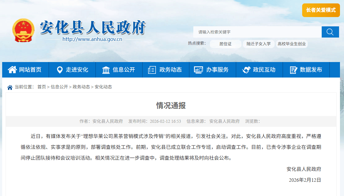 2月12日,湖南省益阳市安化县人民政府发布情况通报:近日,有媒体发布关于“理想华莱公司黑茶营销模式涉及传销”的相关报道,引发社会关注。