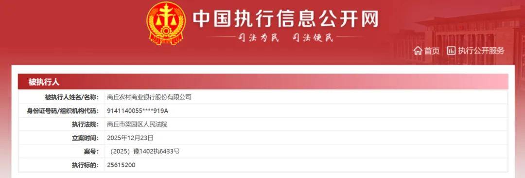 据中国执行信息公开网提供的信息显示,商丘农商银行已成为被执行人。该行2025年12月23日被商丘市梁园区人民法院立案执行,被执行标的2561.52 万元。该行现存4条终本案件信息,被执行标的总金额765.34 万元,未履行总金额765.34 万元,未履行比例100%。