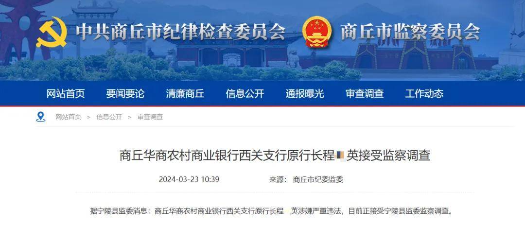 2024年3月份,商丘市纪委监委发布消息称,华商农商银行西关支行原行长程某英涉嫌严重违法,目前正接受宁陵县监委监察调查。
