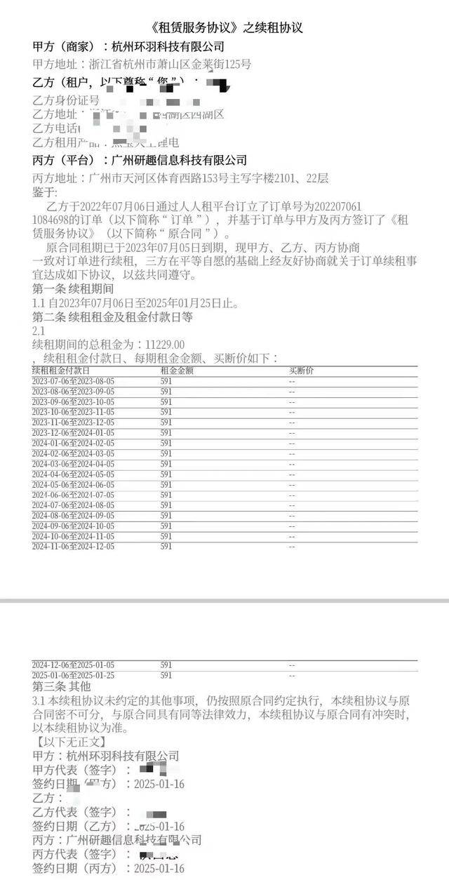记者也联系到人人租平台,运营负责人表示,他们和商户是合作关系,通过平台下的订单,肯定是以平台的协议为准。由于涉及时间久远,他们会通过订单号调查相关情况,核实用户是否知情,并了解商户情况。后续如果有进一步进展,会和记者反馈。