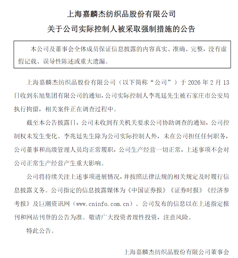 2月14日,嘉麟杰发布公告披露,公司收到东旭集团有限公司通知,公司实际控制人李兆廷被石家庄市公安局执行拘留,相关案件正在调查过程中。
