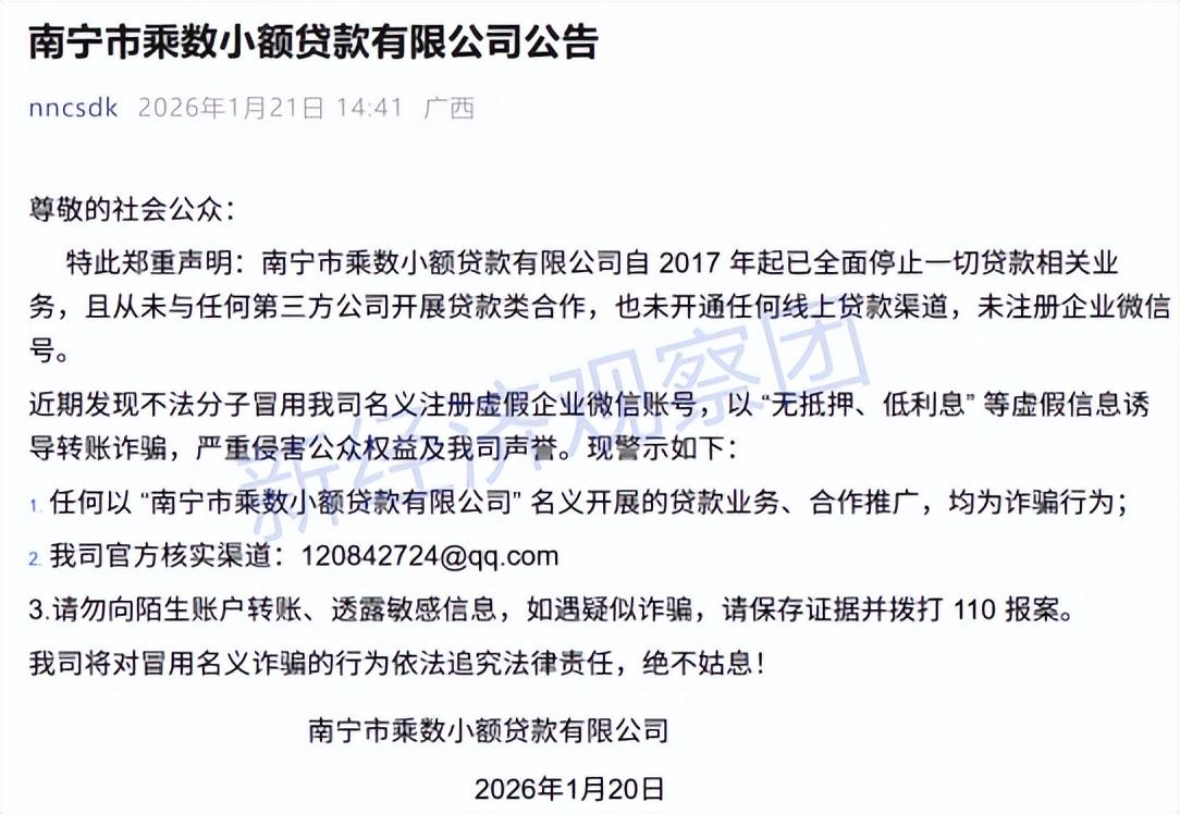 有意思的是,在今年1月26日,乘数小贷在官方渠道发布公告,称公司自2017年起已全面停止一切贷款相关业务,且从未与任何第三方公司开展贷款类合作,也未开通任何线上贷款渠道,未注册企业微信号。乘数小贷称,“ 任何以南宁市乘数小额贷款有限公司名义开展的贷款业务、合作推广,均为诈骗行为”。
