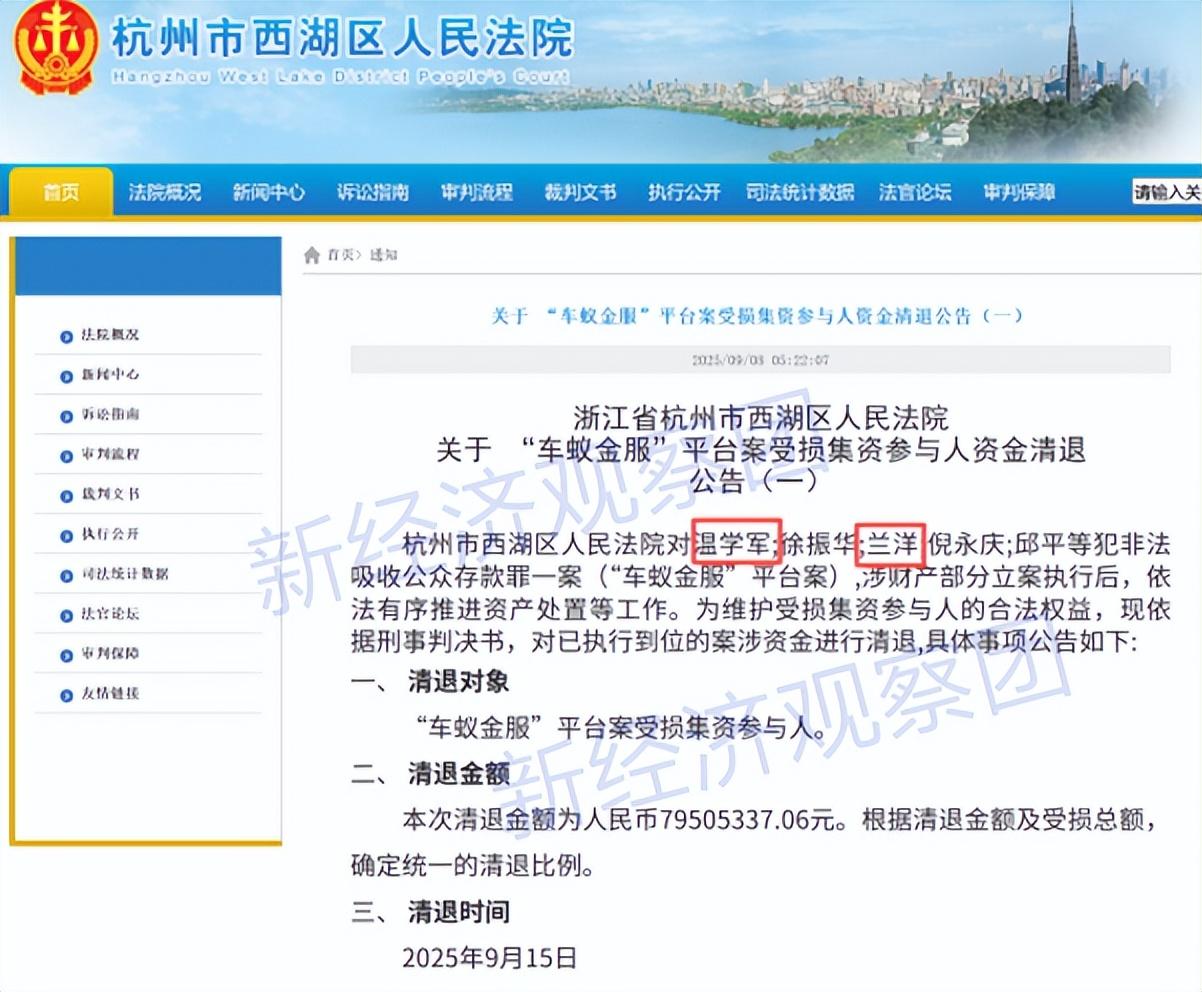 而在2025年9月8日,杭州市西湖区人民法院官网发布了“车蚁金服”平台案受损集资参与人资金清退方案,提到的涉案人员就有温学军和兰洋。