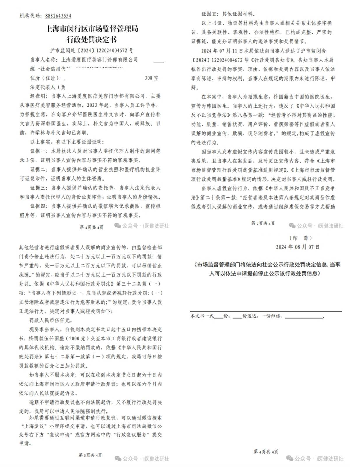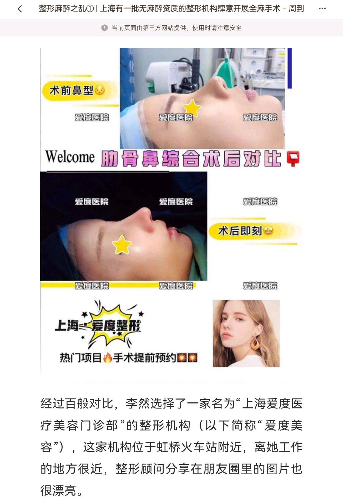 2024年9月“i医健法研社”发布的一篇文章中,曾提到了上海爱度医疗美容门诊部。